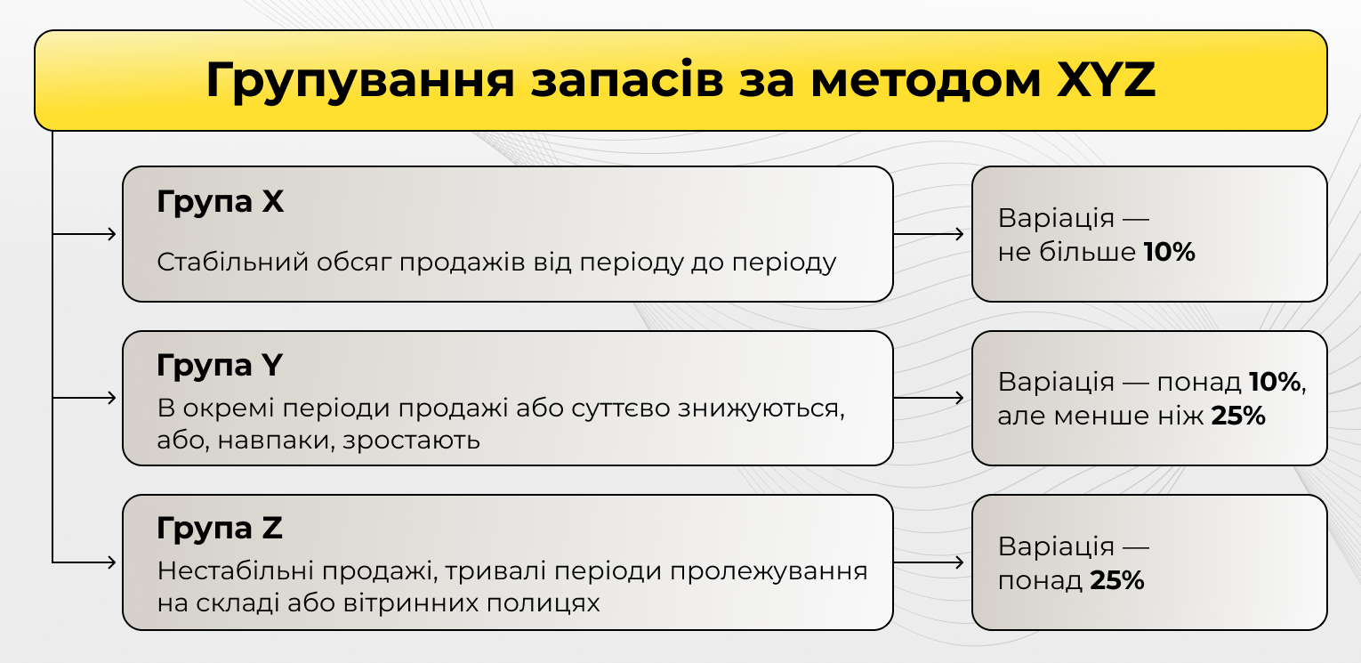 У межах XYZ-аналізу всі позиції поділяються на три групи.