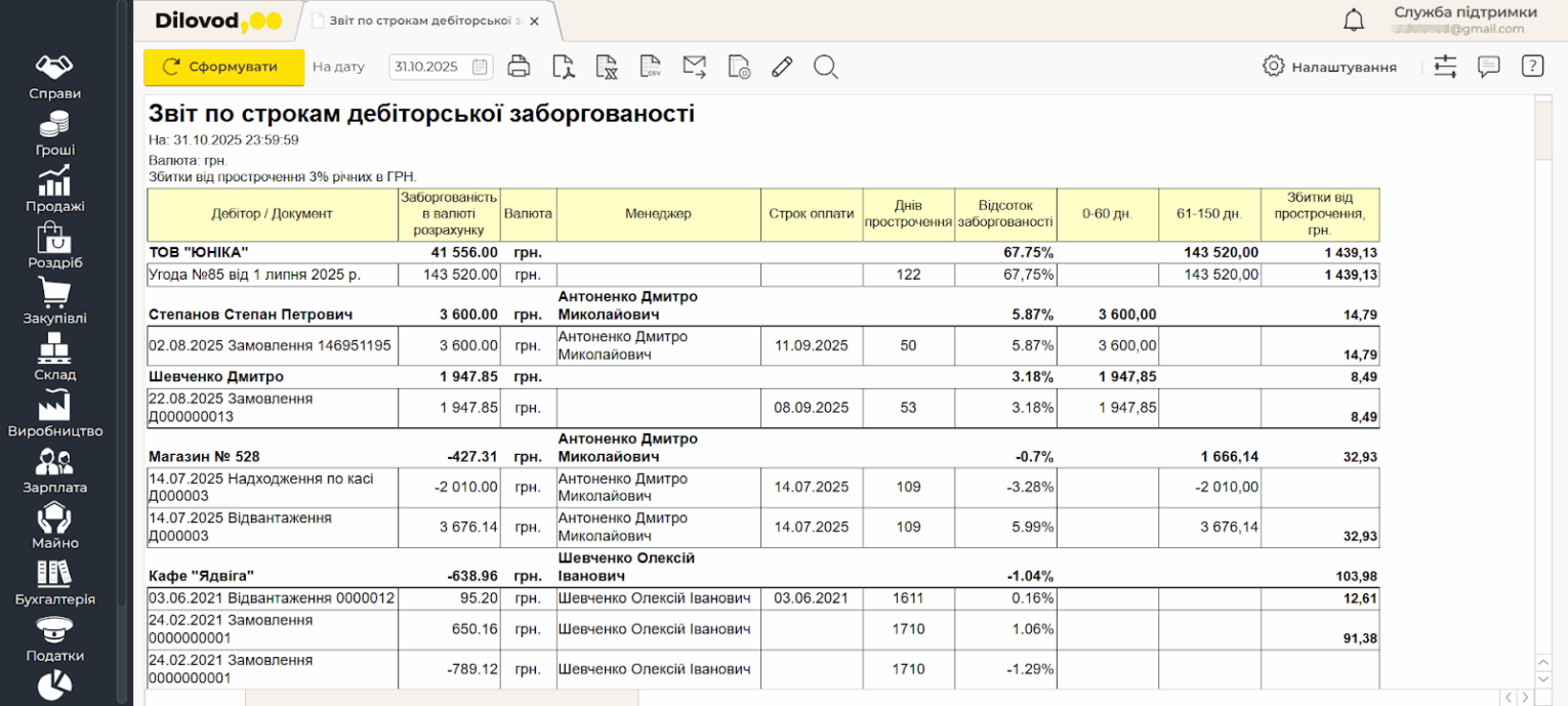 Завдяки звіту ви можете оперативно оцінювати стан взаєморозрахунків, контролювати терміни оплати та своєчасно реагувати на прострочення.