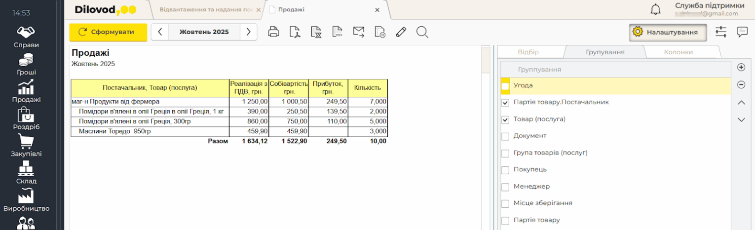 Тепер партії автоматично фіксуються у регістрі, і дані коректно відображаються у документах, зокрема у звіті «Продажі» за постачальниками.