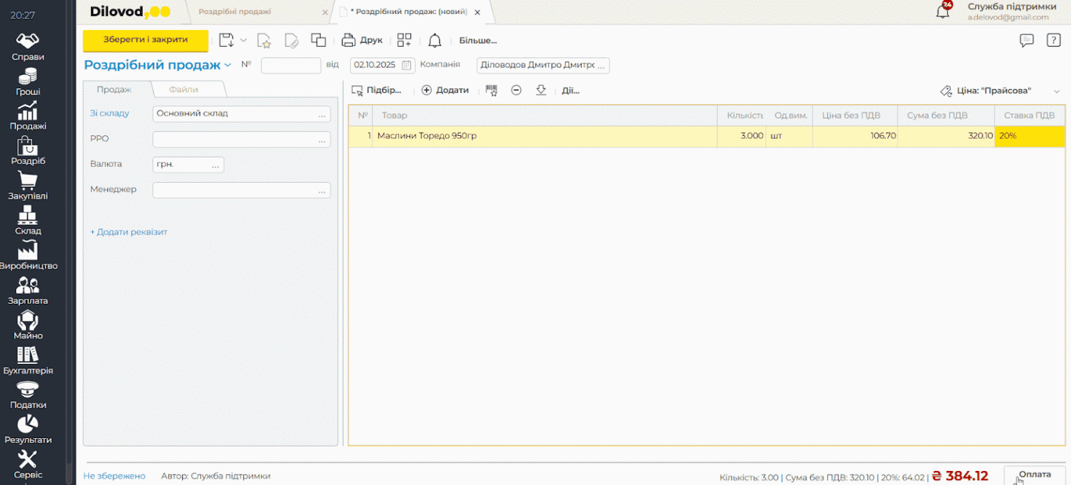 В оновленому Dilovod інтерфейс автоматично адаптується під налаштовані способи оплати. Якщо для роздрібної торгівлі ви не задали певні способи, кнопки «Безготівкова» та «Інше» будуть приховані.