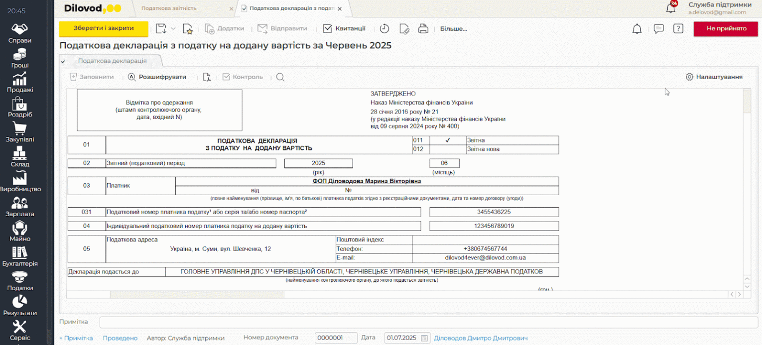 - Перевірка наявності реєстрації звіту ДФС. Додали перевірку наявності звіту в податковому кабінеті перед його відправленням. Якщо звіт уже реєстрували (вручну або через іншу систему), Dilovod повідомить про це і не дозволить повторне відправлення.