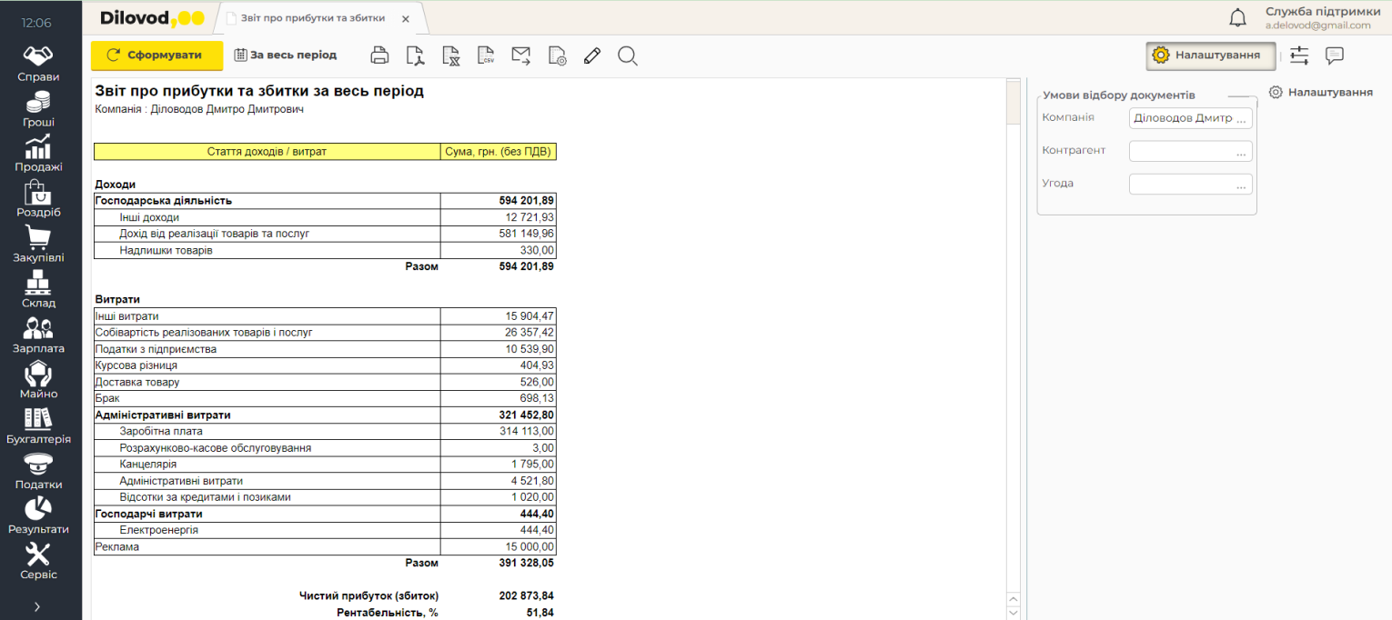 У Dilovod P&L звіт формується автоматично, у зручному шаблоні — програма сама підтягує дані про доходи та витрати, розподіляє їх по статтях і одразу показує фінальний результат. Вам не потрібно вручну складати формули, достатньо обрати період і формат звіту. Приклад P&L в онлайн-бухгалтерії Dilovod ви можете побачити на зображенні праворуч.