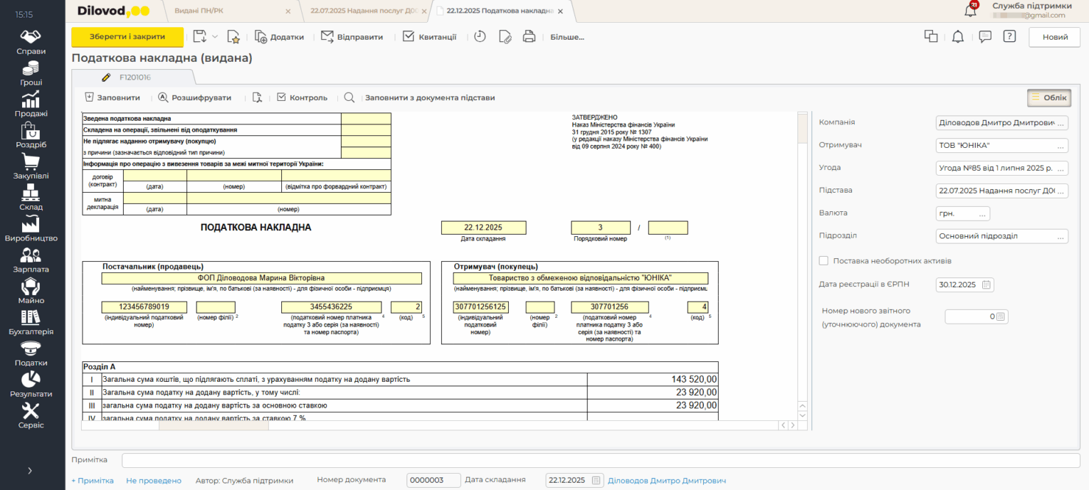 У Dilovod також є майстер виписки ПН. Ви можете спростити та автоматизувати процес створення податкових накладних при часткових передоплатах або відвантаженнях. Інтуїтивний інтерфейс допоможе вам зменшити помилки та заощадити час при заповненні документів.