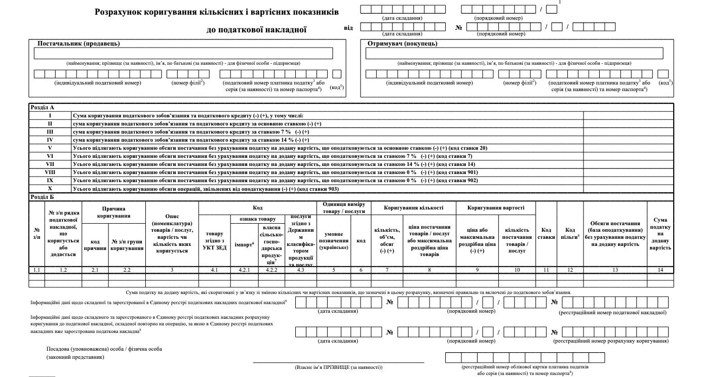 - отримувачем (покупцем) товарів/послуг — якщо сума компенсації зменшується, у цьому випадку постачальник надсилає складений розрахунок коригування отримувачу для реєстрації.