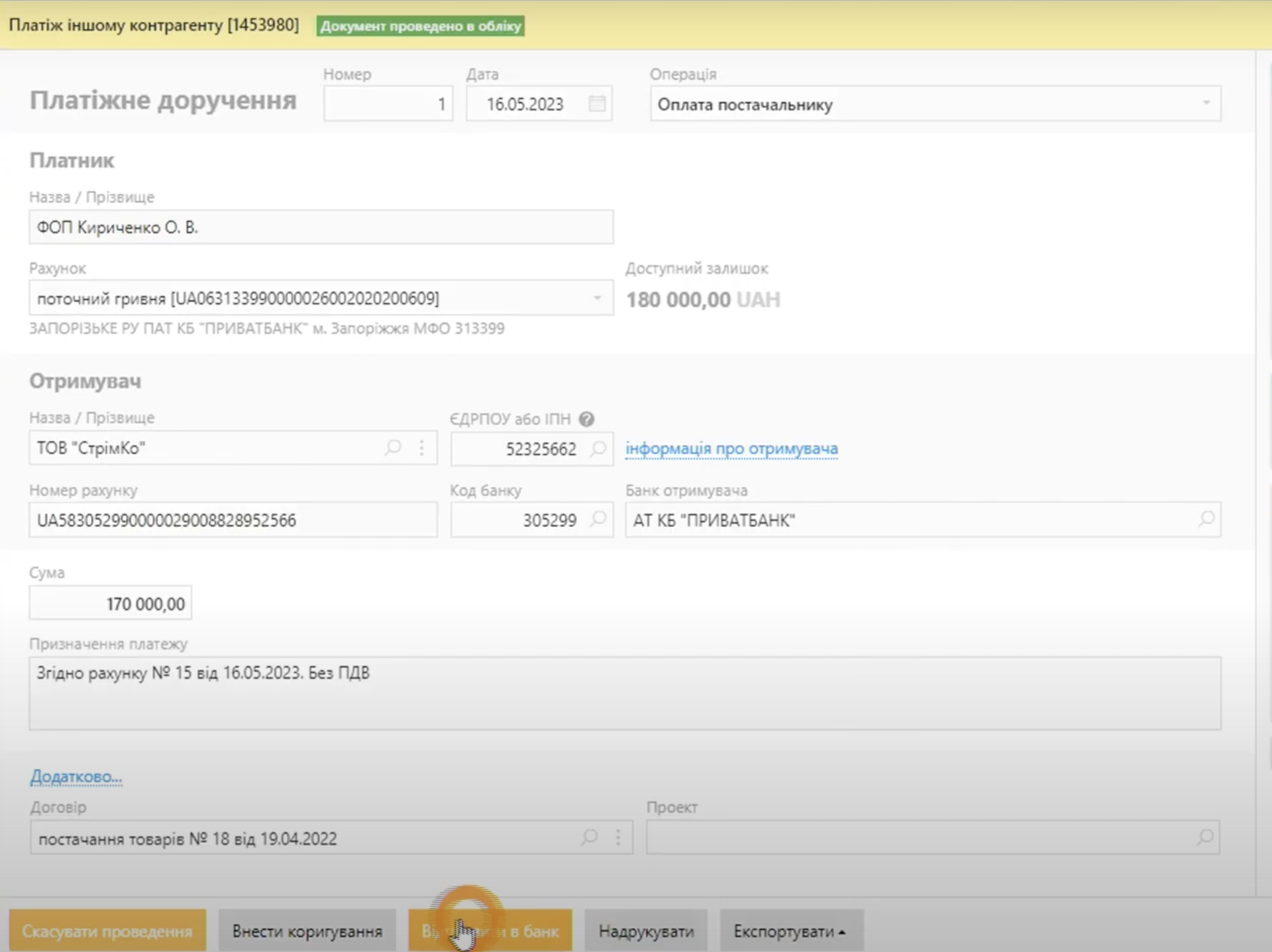 - Интеграция с клиент-банком. Возможность обмена платежными документами и автоматическая загрузка банковских выписок при интеграции с Приват24 для бизнеса.