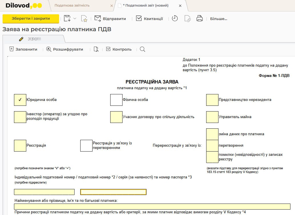 В Dilovod бухгалтер может быстро оформить документы, связанные с получением или прекращением статуса плательщика НДС. В программе доступны: