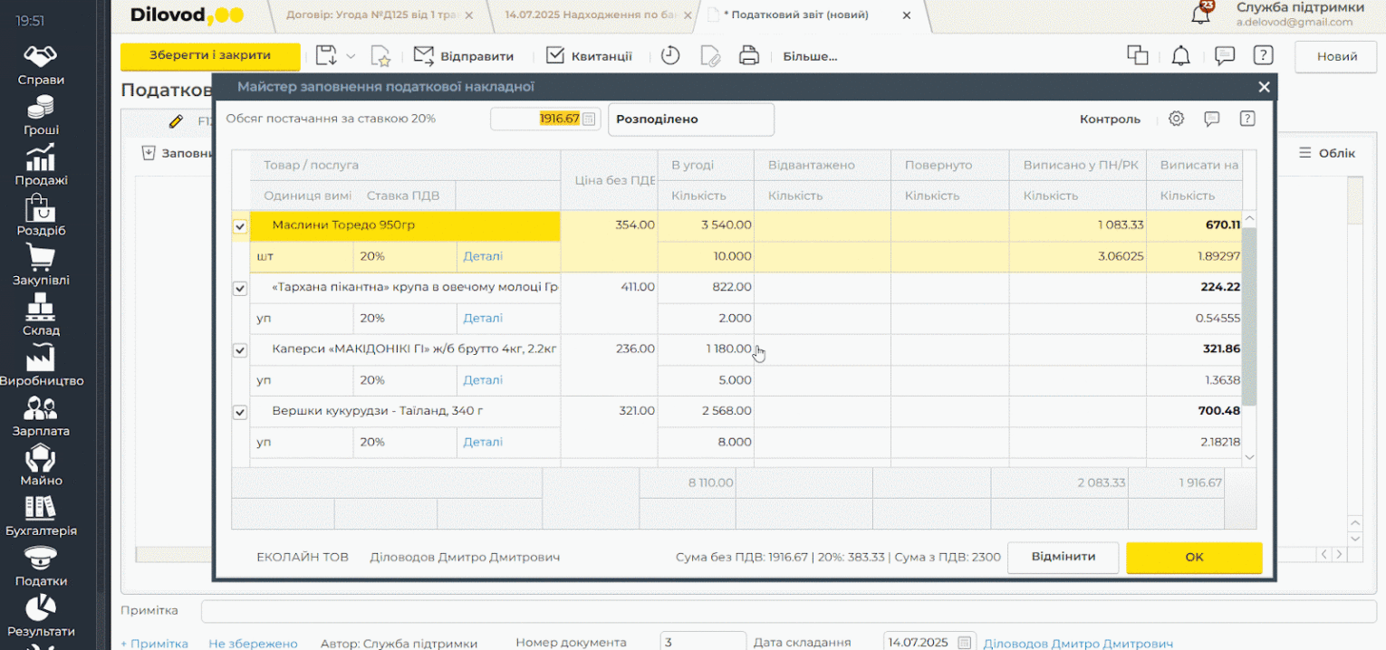 Благодаря этому бухгалтер не пропустит момент, когда нужно начислить НДС, а Dilovod поможет сформировать и зарегистрировать налоговую накладную правильно, без ошибок в датах и суммах.